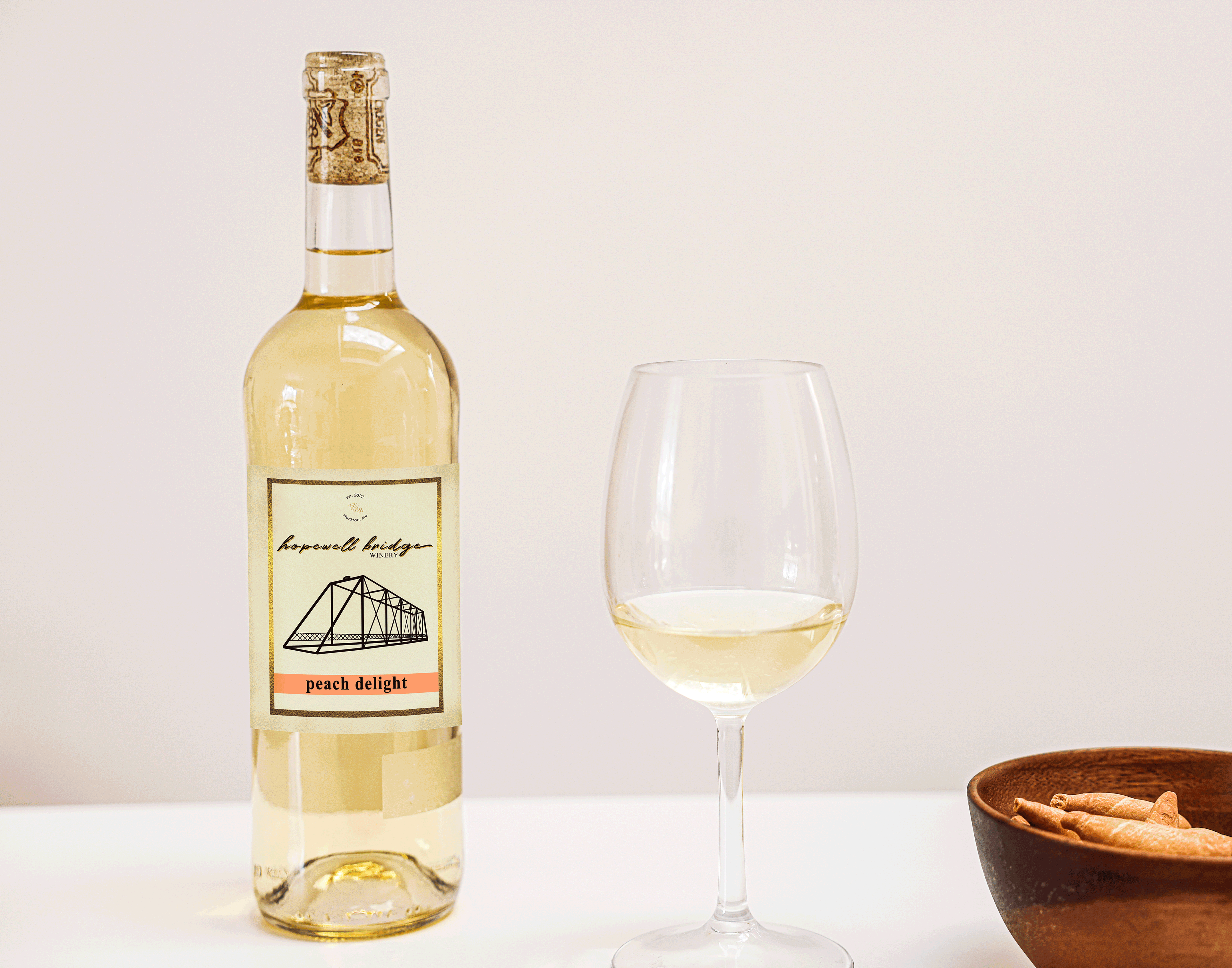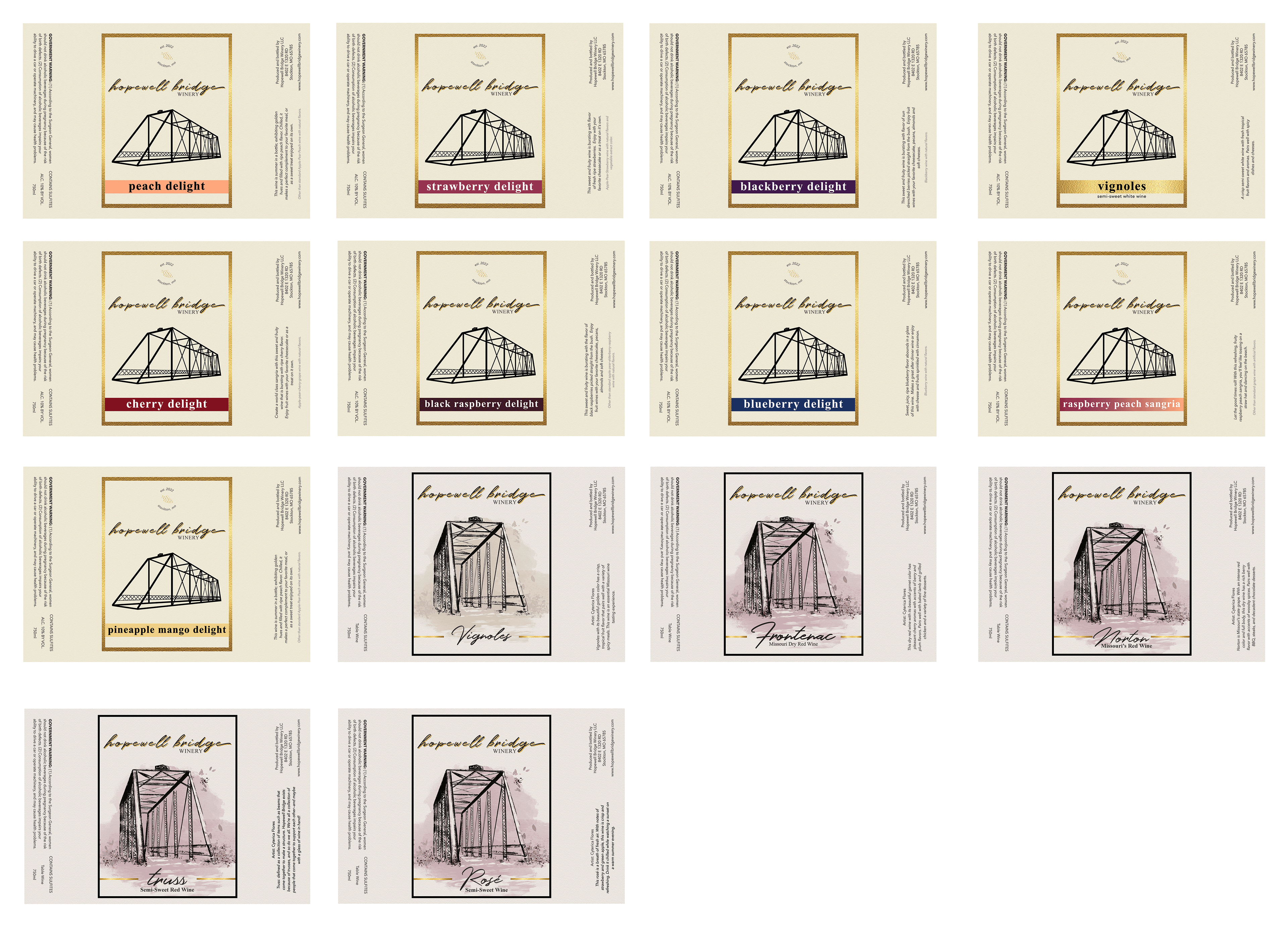 Hopewell Bridge Winery is an idyllic winery and vineyard nestled in the beautiful countryside near Stockton, Missouri. They grow and harvest their own grapes on-site to create several unique varietals. There is a rustic bridge just around the corner, inspiring the company's name and logo. Sit back and relax while sipping on Missouri's finest, the bottle showcasing labels that represent the sophisticated flavor.