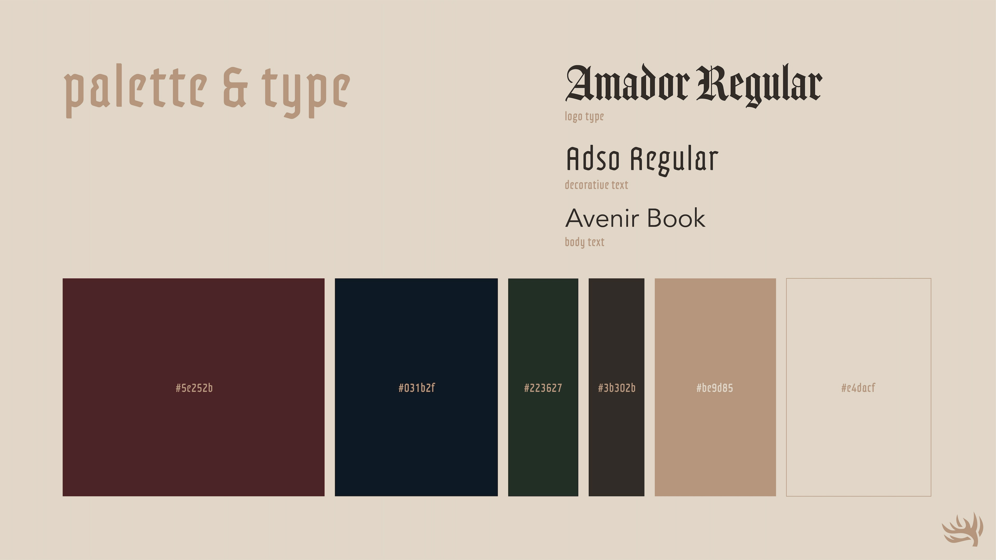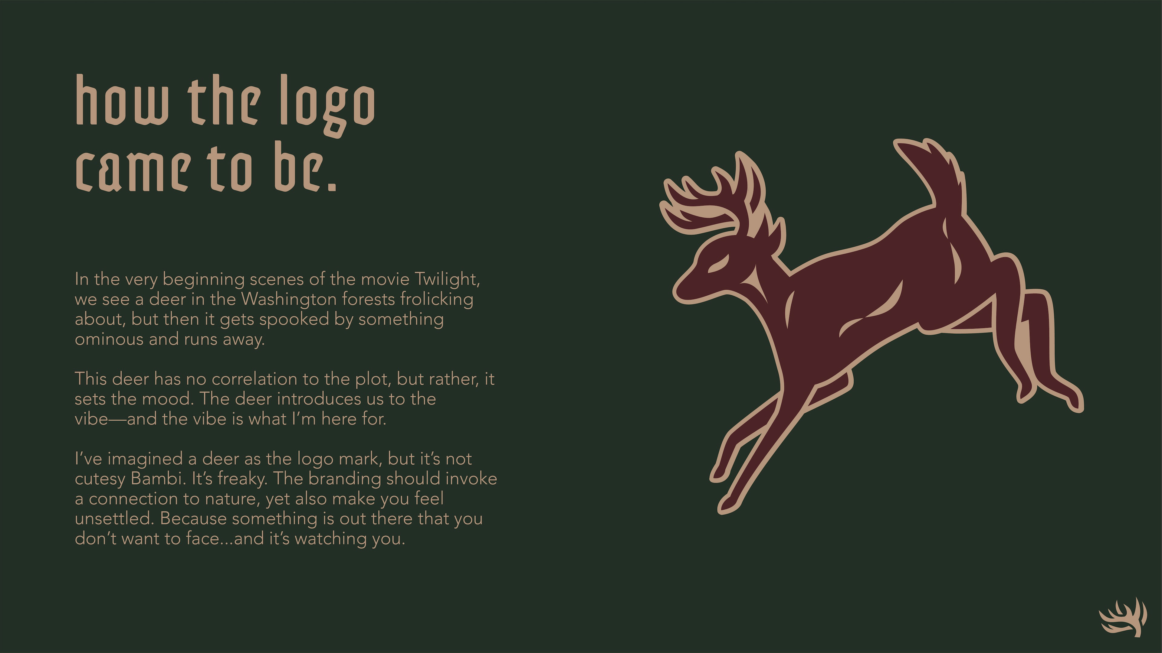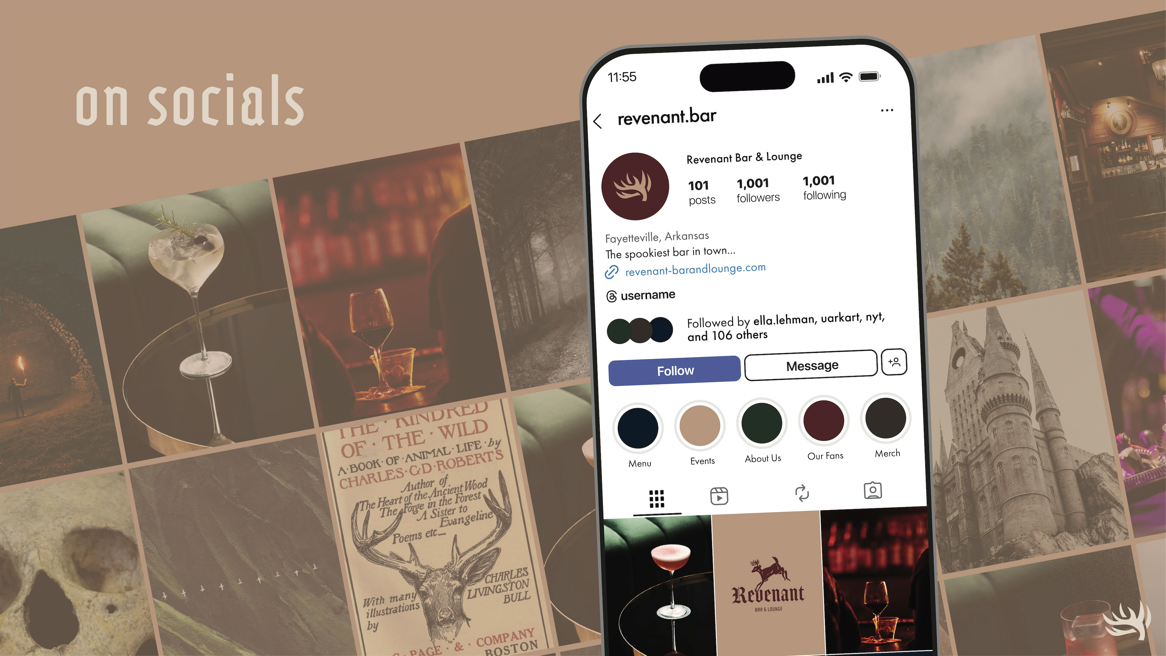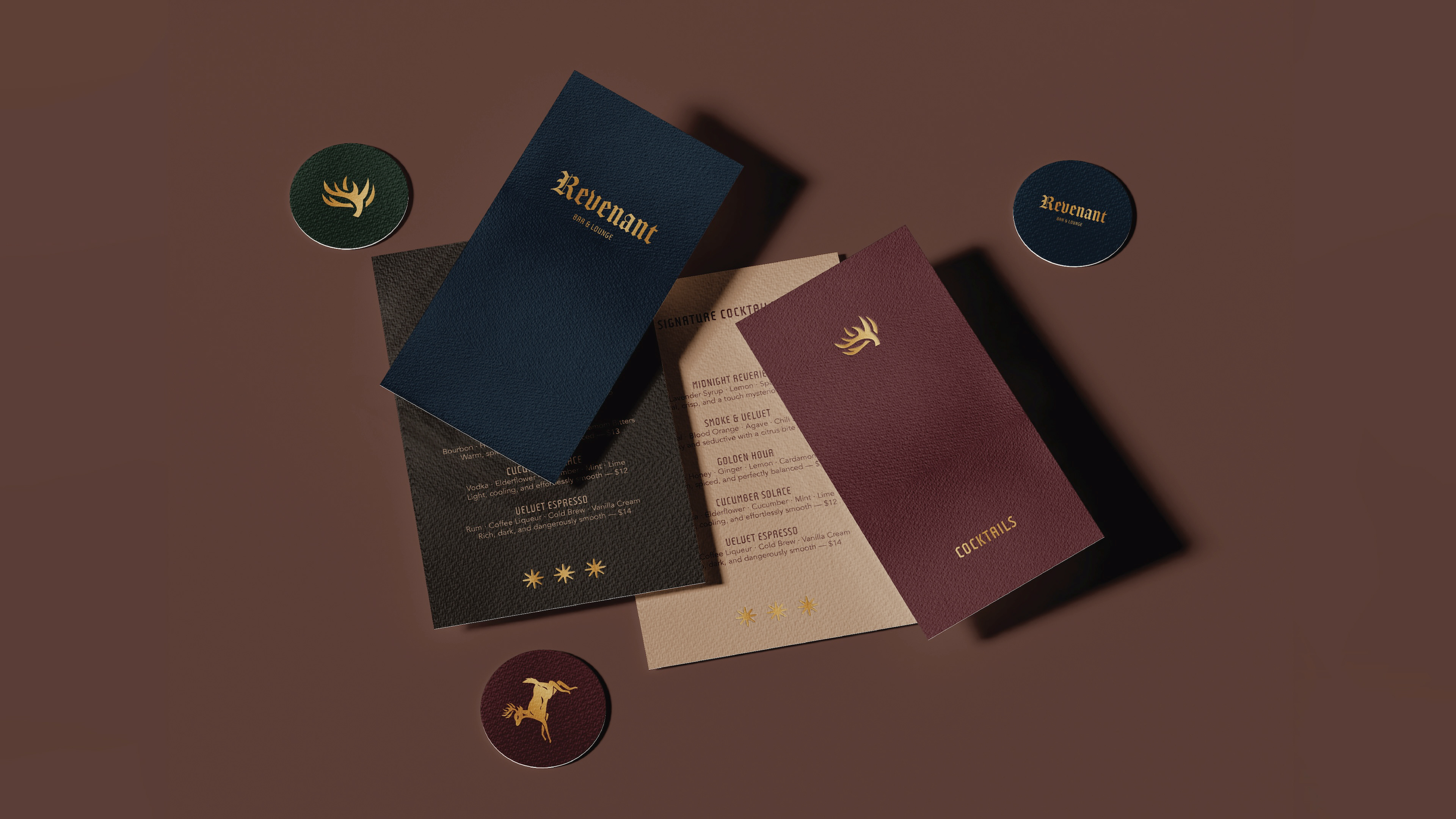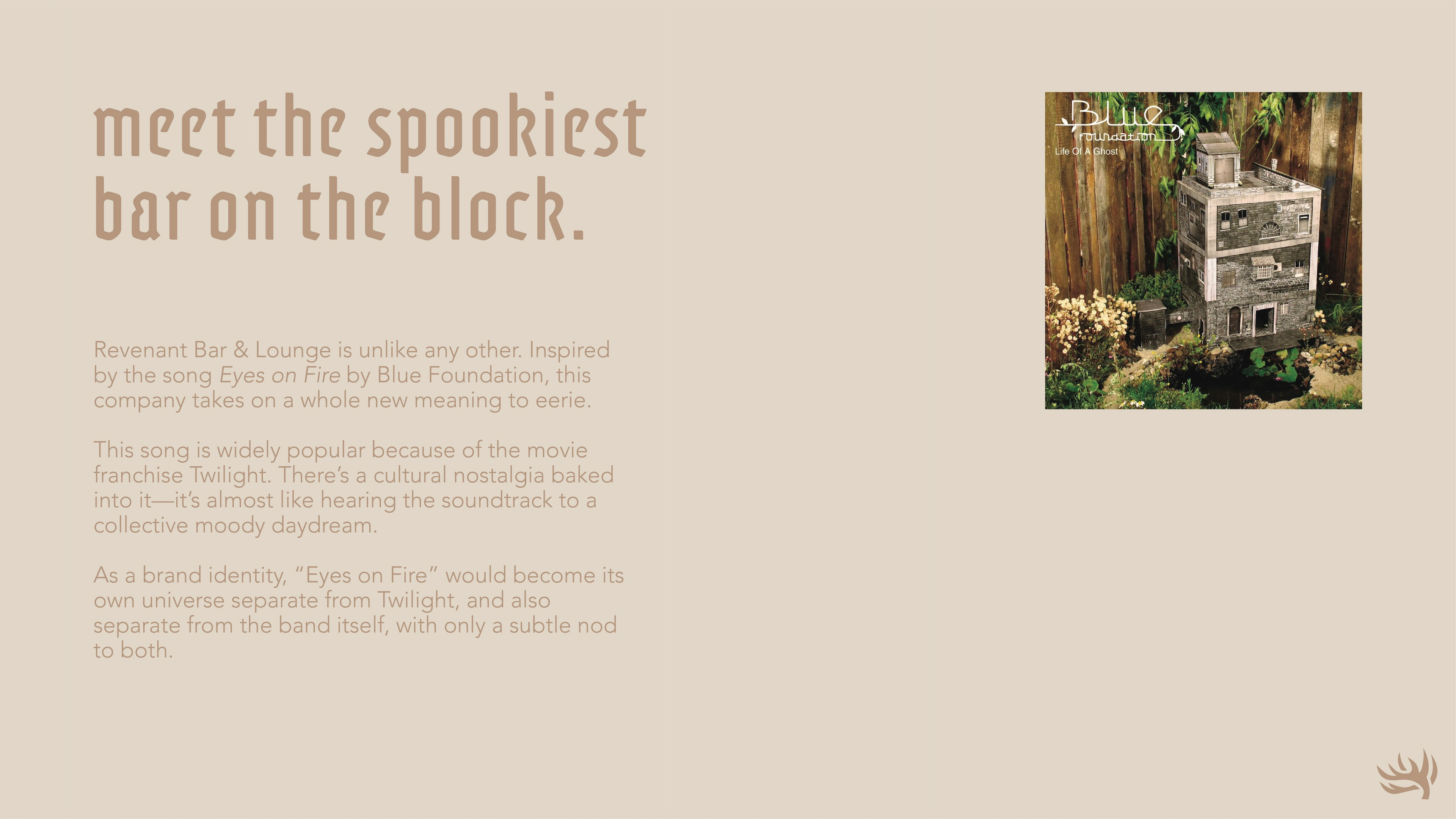 Revenant Bar & Lounge came to life from the song "Eyes on Fire" by Blue Foundation. Invoking a moody and mysterious energy, it was only perfect to grow this melody into an eerie bar & lounge. See more below for specific brand details.