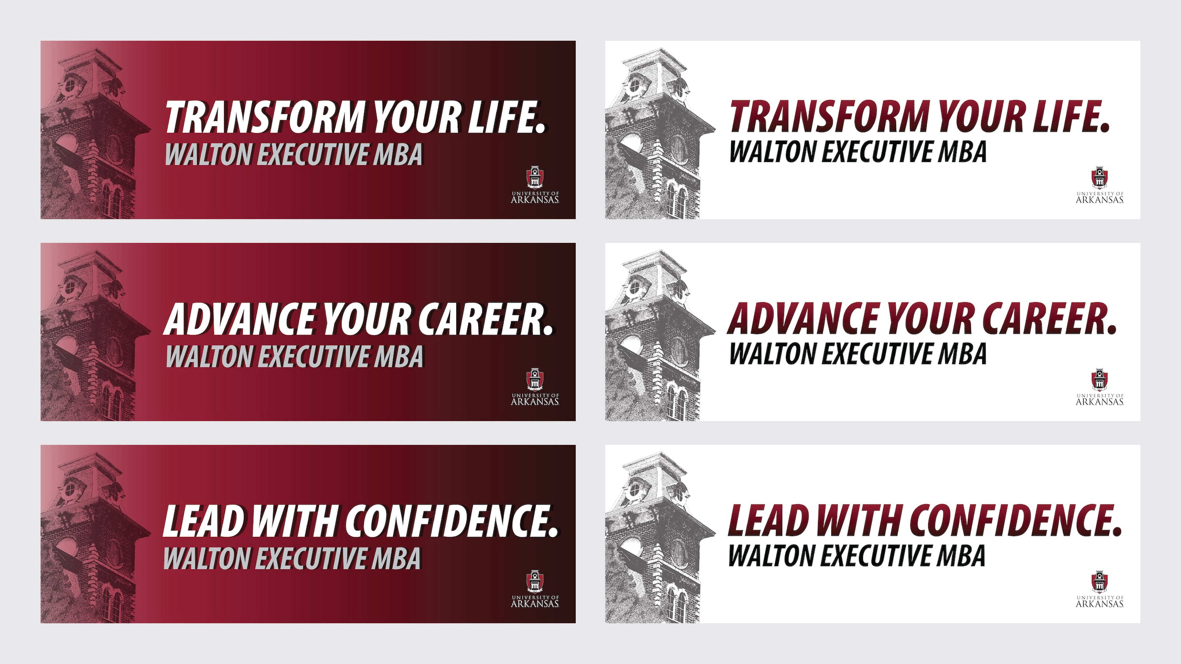 My team and I designed a high-impact billboard campaign to promote the Executive MBA program at the Walton College of Business. Our goal was to create a bold visual statement that would resonate with ambitious professionals seeking career advancement. These ads ran live for several months, spanning across billboards along several miles of I-49.